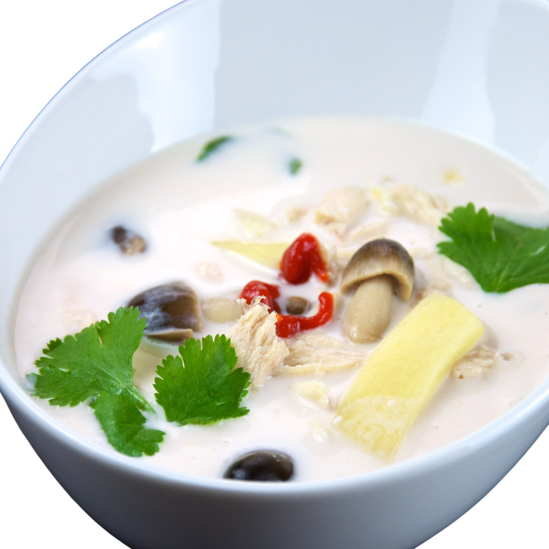 Soupe thaïe au lait de coco, poulet, champignons, citronnelle et galanga.